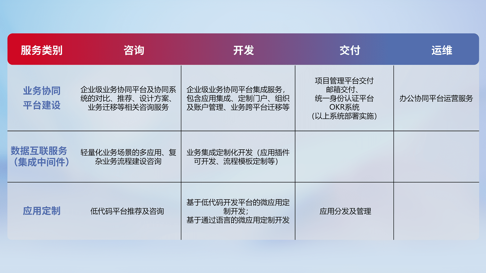 针对钉钉、、、企微、、、、IDaas等平台级产品提供产品的规划、、、、方案、、、、交付、、定制化开发等服务,,实现如统一协同办公、、智能客户服务、、、、混合会议管理、、、、智能数据查询、、等业务场景,,,实现数字化转型。。。。
